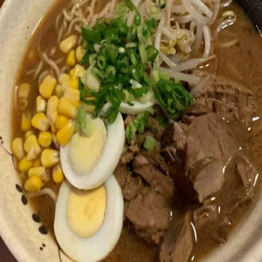 Chashu, milho, ovo cozido, repolho refogado no caldo do missô.